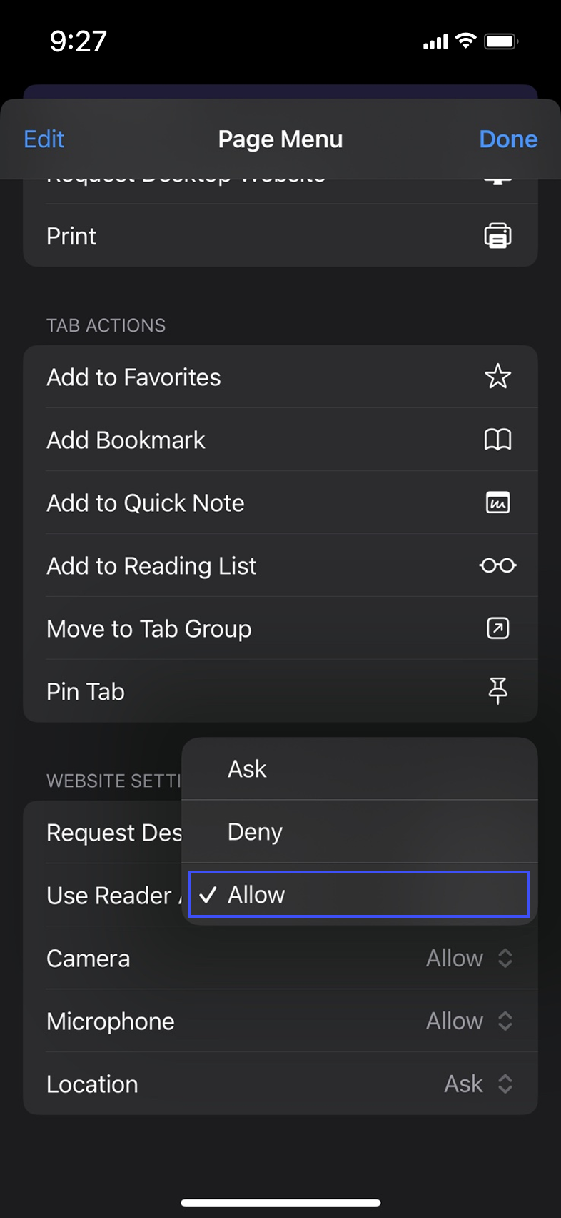 Step 5: Tap each option (Camera and Microphone), then select “Allow”.